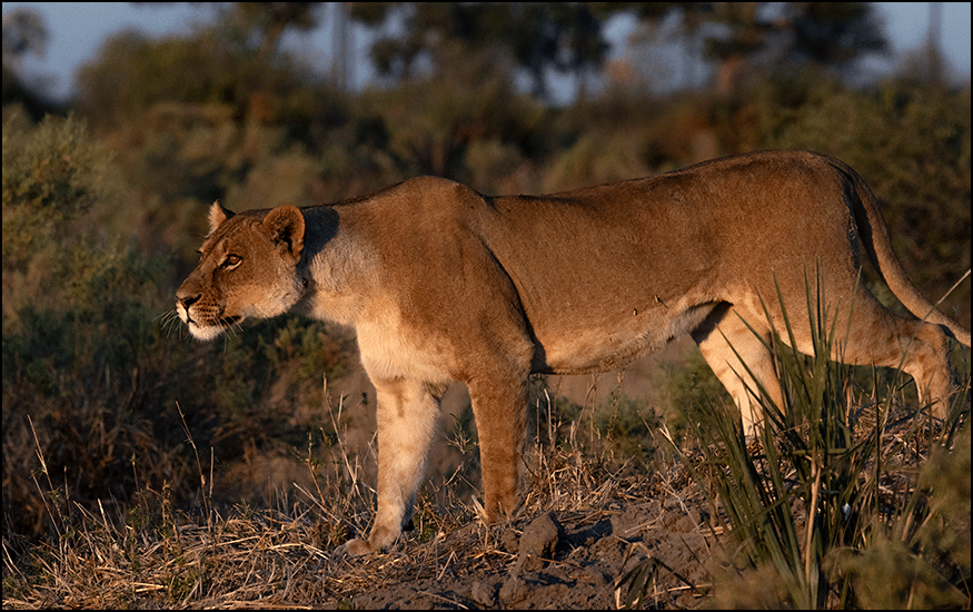 At the river, red lechwes splashed through the marsh, and a fish eagle perched proudly in a treetop, his white head bright in the sunshine, and a gleam of light in his eye. Gee was tracking the lions from the night before, following their prints along the water’s edge.