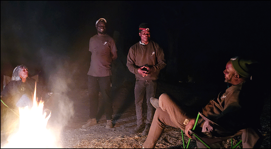 A pearl-spotted owlet gave its soft whistling call as we gathered around the fire, listing our favorite sightings and reliving the day. The firelight made the whole scene feel timeless. Even an unsuccessful lion hunt was thrilling to witness, and we eagerly recounted it until Mosa came to announce dinner.