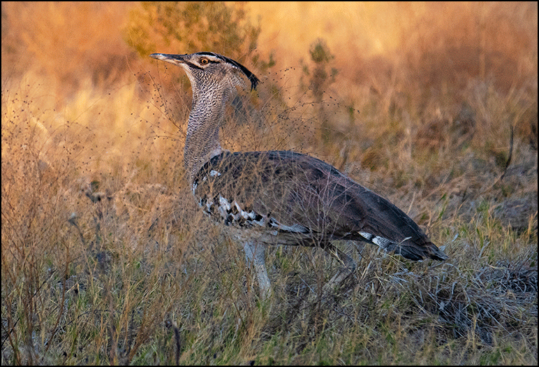 Almost immediately we came upon two kori bustards. The male was in full display, jumping, twirling, and flapping his wings in a proud, slightly ridiculous mating dance. Shafts of early light caught his feathers, warming him in a golden glow. He looked both magnificent and faintly absurd.